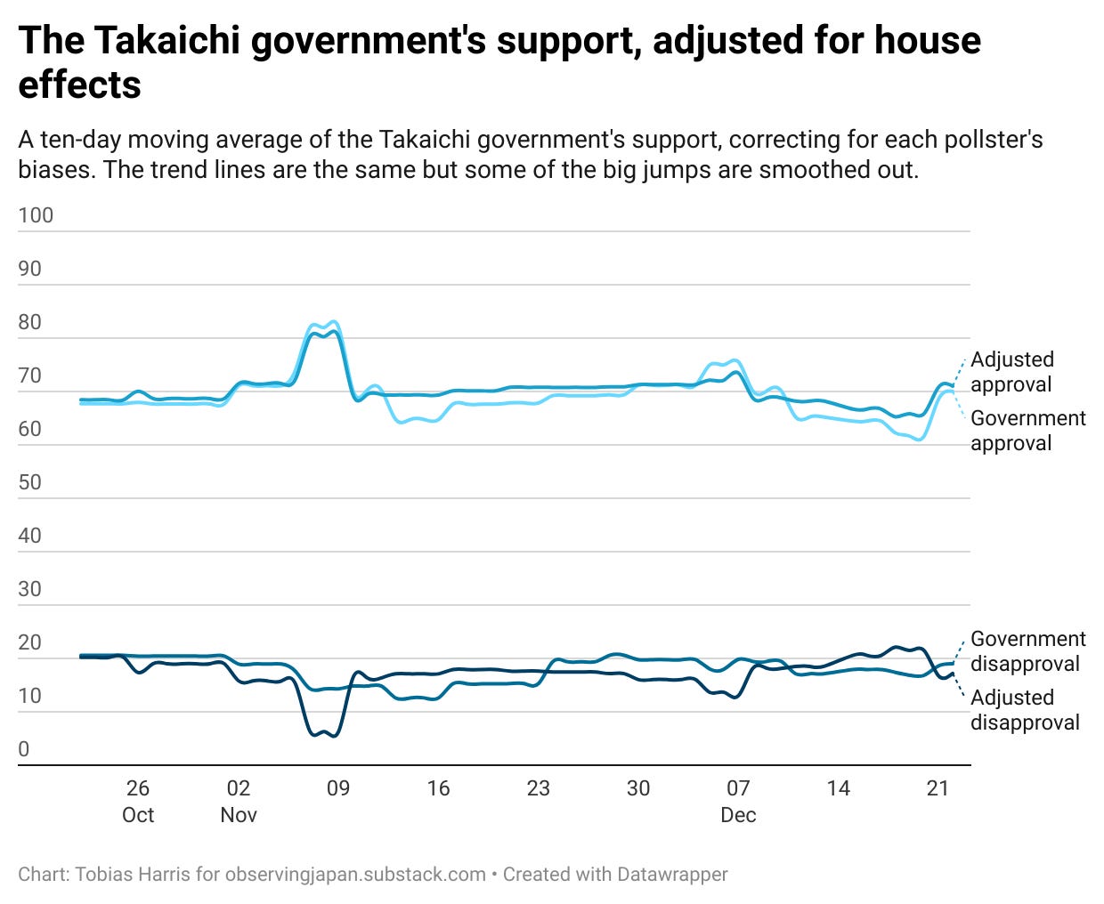 All readers can access regularly updated charts of a ten-day moving average of the government’s popularity here.